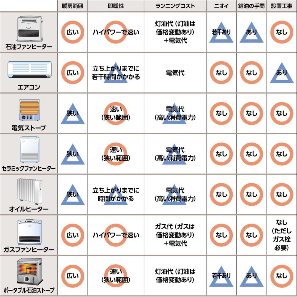 石油ファンヒーターは、主に灯油を燃料として使用します。迅速に温風を生成し、部屋をすぐに暖めることができるため、すぐに暖かさが必要な場合に重宝します。しかし、灯油の補充や定期的なメンテナンスが必要であり、その手間がかかる点がデメリットとされています。